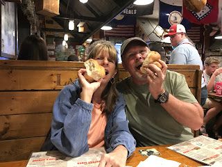 So the next time Kim came around he asked her if she offered carry out service. She, of course, said yes and then her told her she was going to have to carry him out. Well, she didn’t miss a beat coming back with “Well hop on! I’ll carry you out!” And he took her up on it! My picture was hurried and not the best quality but this had to be recorded! Thanks Lambert’s and Kim R. for helping us make some great memories.....we hope to visit again soon.